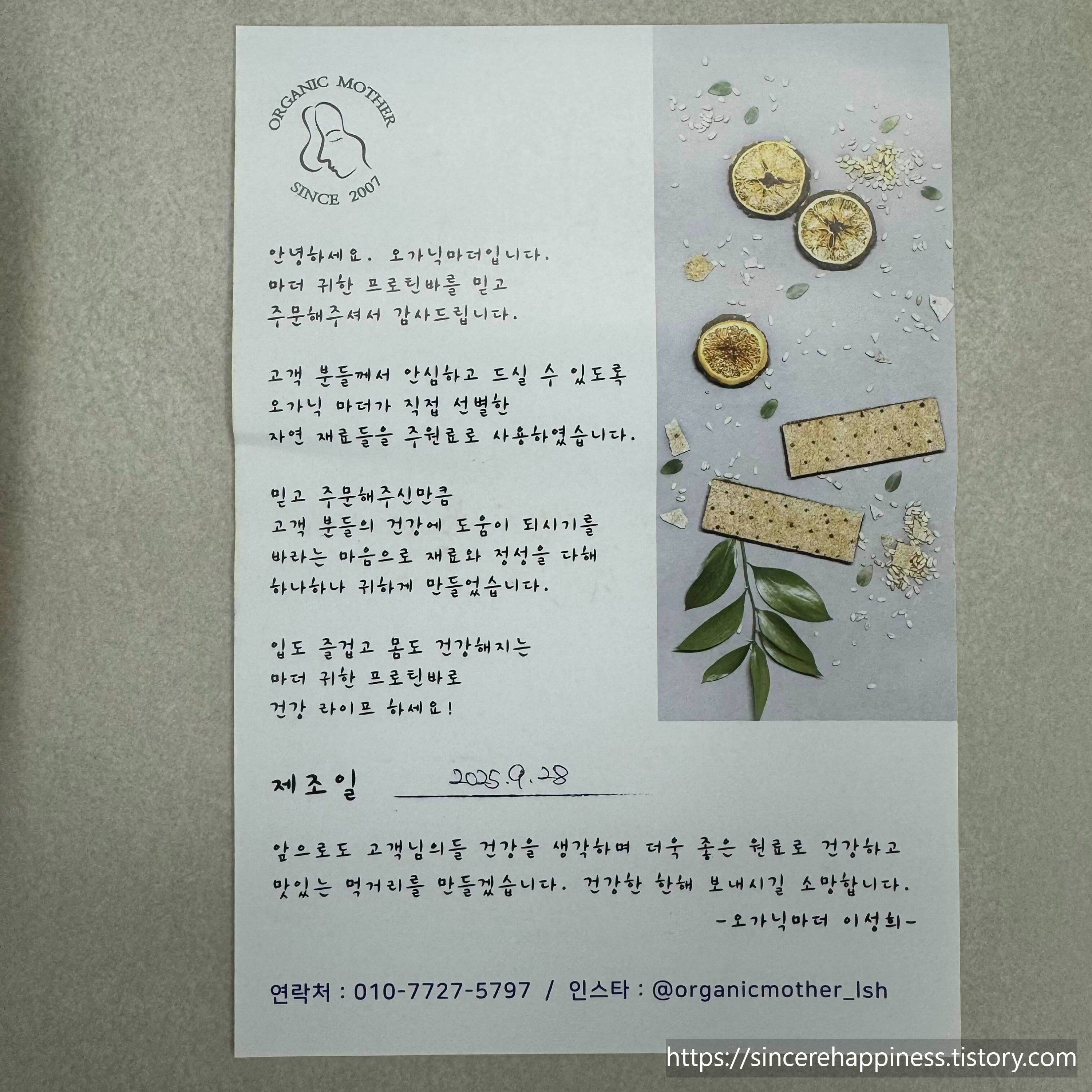 https://sincerehappiness.tistory.com/342 [오가닉마더]_건강하고 맛있는 100% 수제 먹거리 "마더 귀한 프로틴바" 내돈내산 후기🌿ORGANIC MOTHER🌿 요즘 인스타에서 건강 인플루언서들 팔로우하고이런저런 정